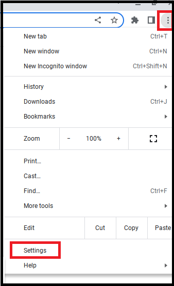 3. Open the Chrome Browser of the device you are installing the certificate on and navigate to chrome://settings. Click on the 3 dots at the top right-hand side of the browser and click setting at the bottom of the menu.