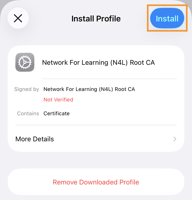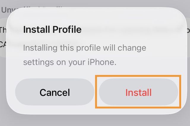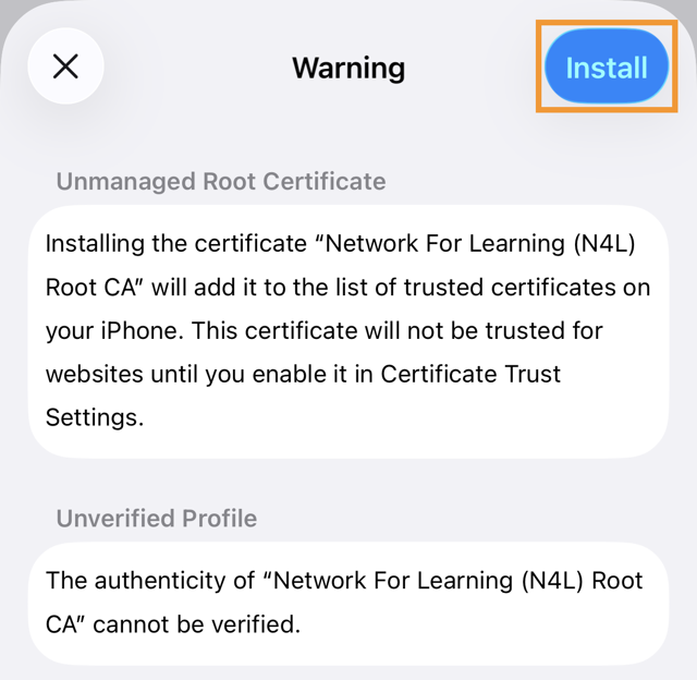 5. A certificate warning will be displayed. Tap Install. If a second prompt is displayed, tap Install again.