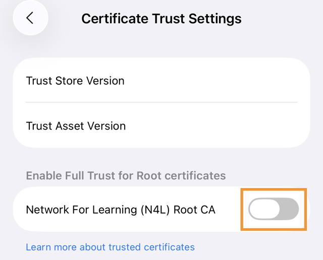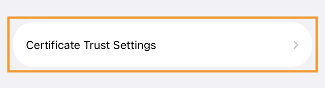 2. The installed Root Certificate will be displayed in a section entitled "Enable Full Trust for Root Certificates." Tap the toggle button to enable the certificate.