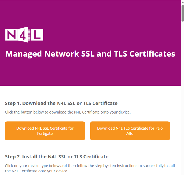 2. Tap on the Download N4L SSL Certificate for Fortigate or Download N4L TLS Certificate for Palo Alto button.