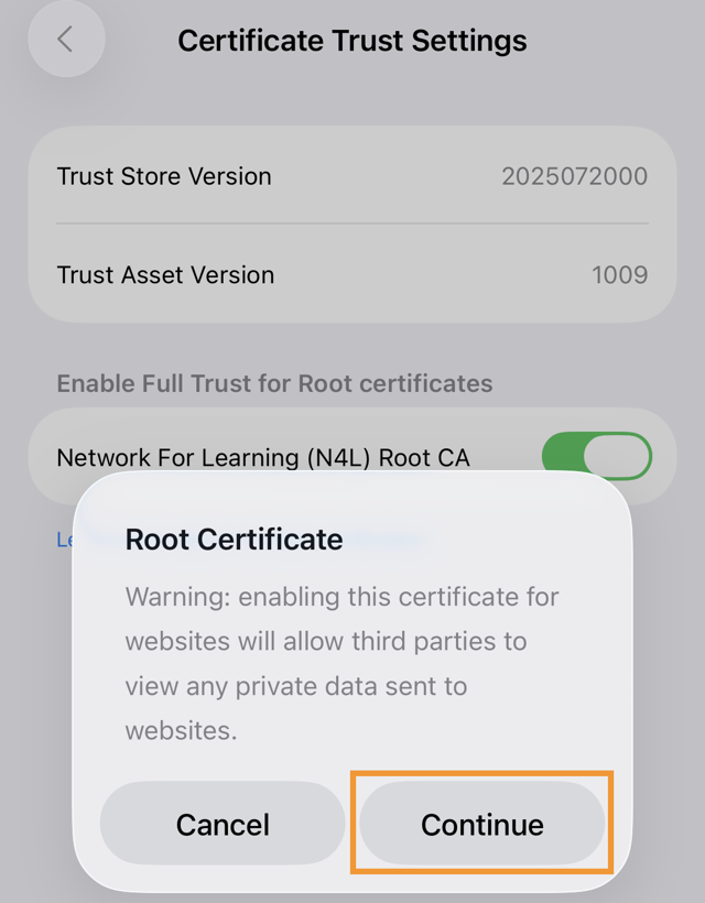 Note: If your network has a number of iOS devices, you may prefer to deploy the certificate via your school's MDM (Mobile Device Management) solution, or Apple Configurator 2.