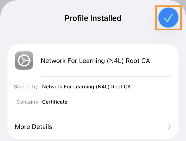 6. The Profile Installed screen is displayed. Tap on the Check icon.